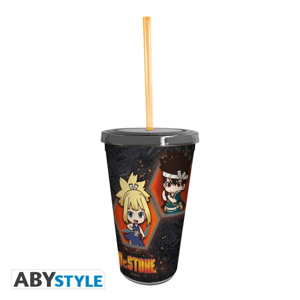 Equipped with an antigravity fluid transport tube (our R&D department is calling this a “straw”) and a spill containment barrier (or “lid”), this revolutionary device is a great way for Dr. Stone fans to get their daily dose of H20.