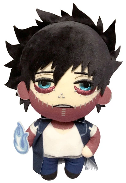 Dabi is seen wearing his ripped, dark blue jacket and holding a blue fireball. Great detail is used to show the gnarled, scarred skin and stitches on his face and arms from losing control of his quirk. Add this plush to your collection, but make sure to stay on his good side!